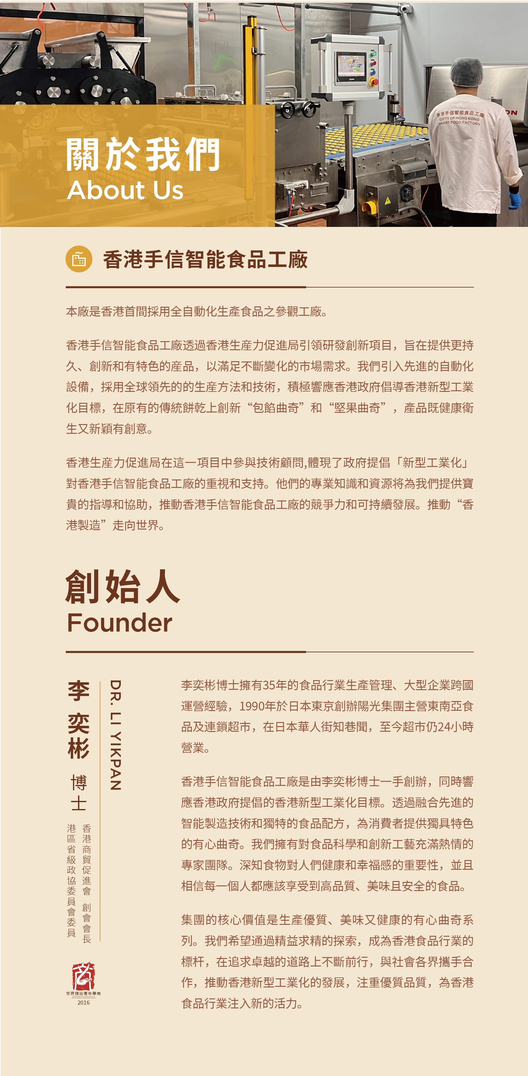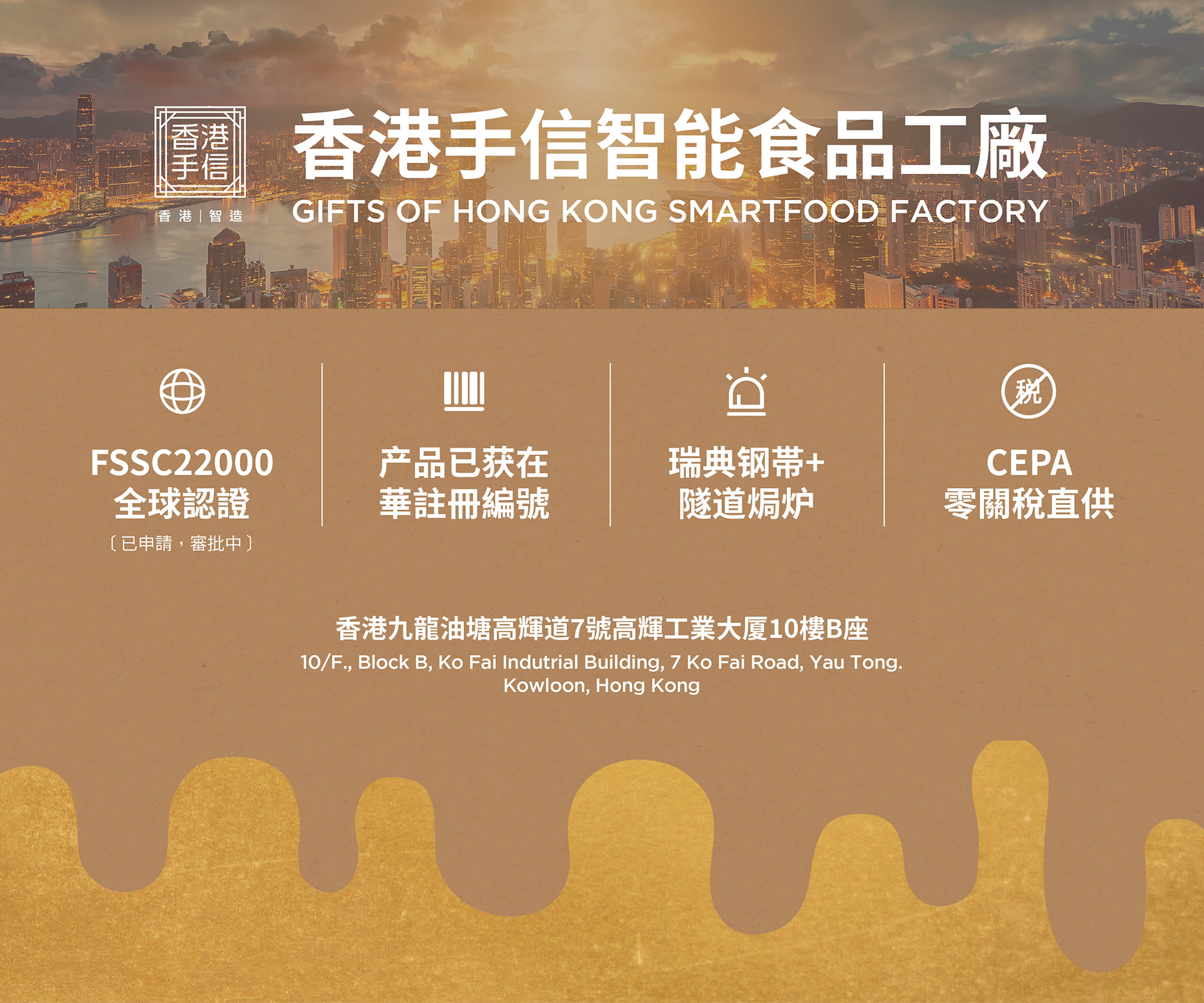 關於我們 「香港手信」有心曲奇,用心智造 我們的產品結合:文化、傳統、創新、融合四大主要元素。既有中西薈萃,華洋共處,風味獨特,精美可口,富有香港特色的健康品牌。又有傳承中華文化,凝聚了民以食為天,造福天下之美意。令我們的產品遍佈全球,載譽天下。 我們擁有經驗豐富的食品專業研發團隊,香港廠房正在申請FSSC 22000食品安全管理體系認證。受惠於2024年5月21日實施的【輸內地香港製造食品安全監管及口岸便利通關合作協議】,我們的產品可免檢零關稅進入內地市場。我們有創意品牌包裝設計,並有靈活的零售店陳列展示配套,持續助力業界零售商,為客戶提供多元化及富有主題色彩的食品。