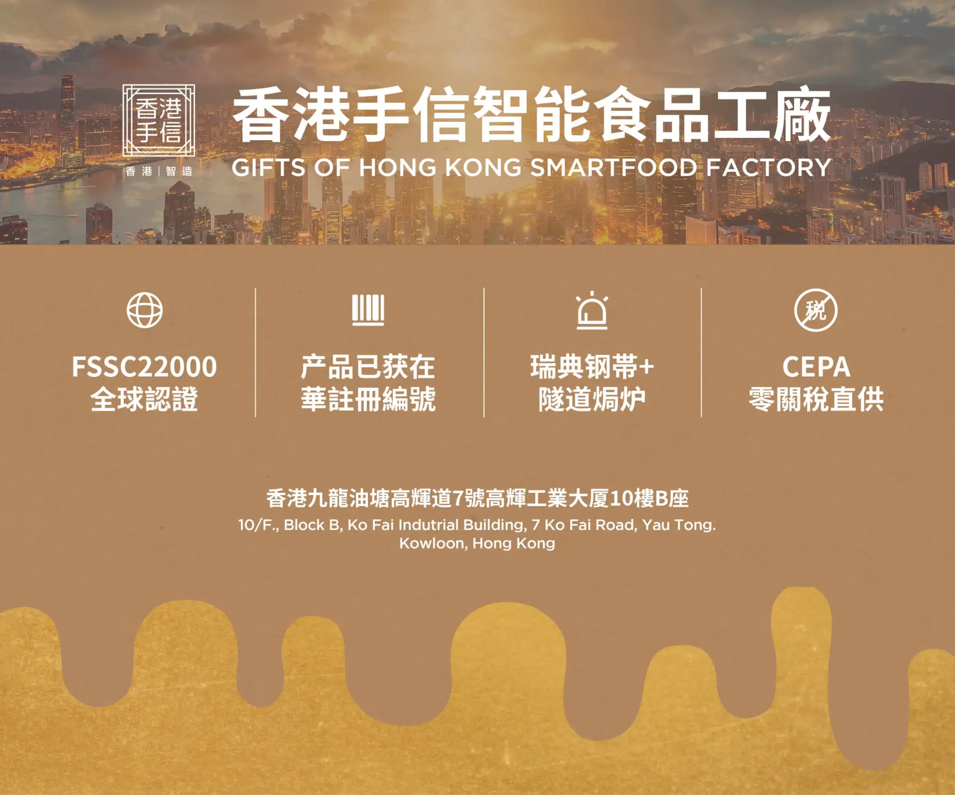 關於我們 「香港手信」有心曲奇,用心智造 我們的產品結合:文化、傳統、創新、融合四大主要元素。既有中西薈萃,華洋共處,風味獨特,精美可口,富有香港特色的健康品牌。又有傳承中華文化,凝聚了民以食為天,造福天下之美意。令我們的產品遍佈全球,載譽天下。 我們擁有經驗豐富的食品專業研發團隊,香港廠房已通過FSSC 22000食品安全管理體系認證。受惠於2024年5月21日實施的【輸內地香港製造食品安全監管及口岸便利通關合作協議】,我們的產品可免檢零關稅進入內地市場。我們有創意品牌包裝設計,並有靈活的零售店陳列展示配套,持續助力業界零售商,為客戶提供多元化及富有主題色彩的食品。